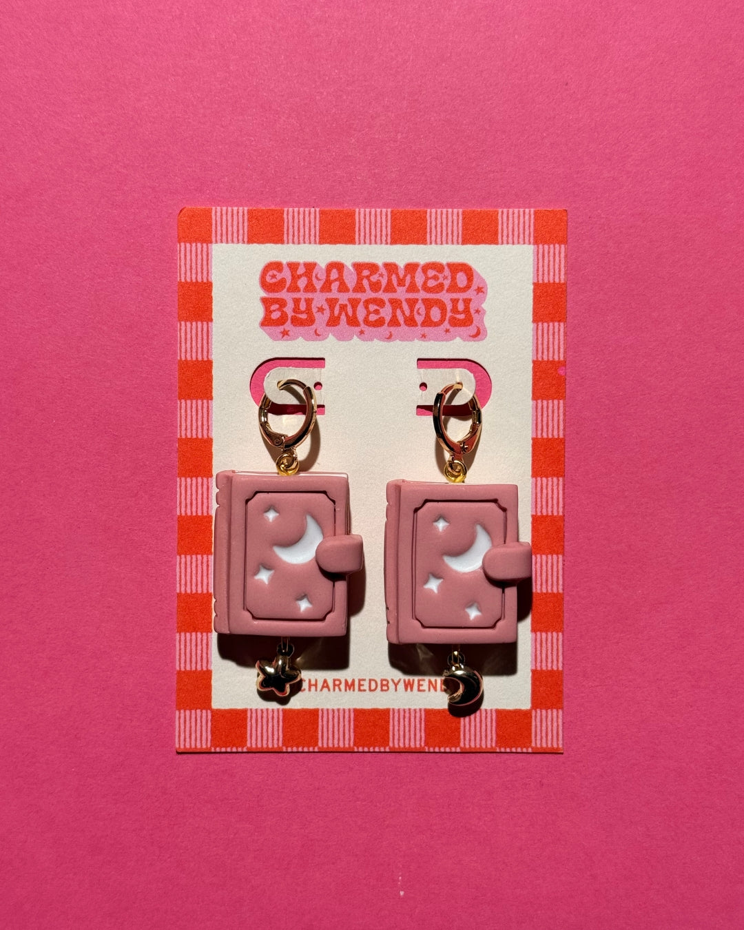 Handcrafted polymer clay earrings inspired by celestial magic. Each pair features delicate stars and moons with our signature Charmed by Wendy aesthetic. Lightweight and comfortable for all-day wear, these book-shaped beauties are finished with gold-plated huggie hoops that keep them secure and stylish.