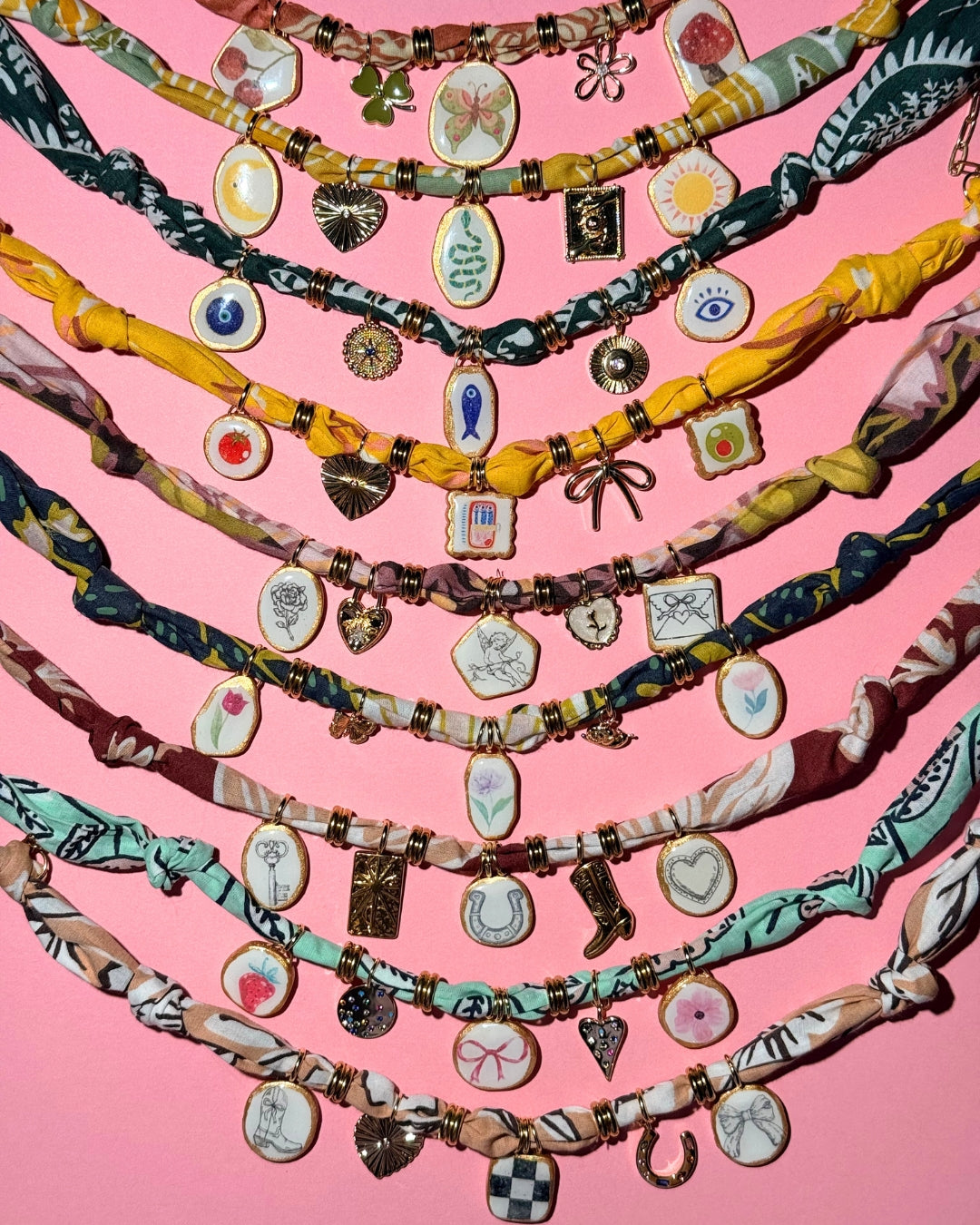 Crafted from 100% cotton Handker bandanas, this unique piece features three handmade polymer clay charms and two gold-plated metal charms. The stainless steel paper chain lets you adjust the length up to 19" for the perfect fit. Light, comfortable, and one of a kind, this necklace is a fun way to express your style!