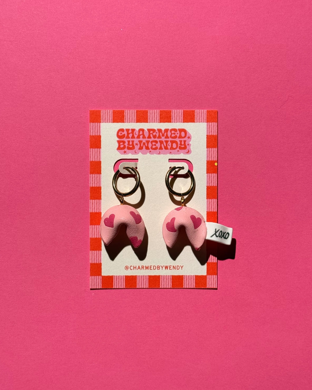 Spread a little luck and love with these charming handmade fortune cookie earrings. Crafted with playful detail, each earring features a delicate heart print and a tiny fortune peeking out that reads "XOXO"—the perfect reminder to share hugs and kisses. Hanging from durable stainless steel hoops, these whimsical accessories are comfortable for everyday wear and make a delightful conversation starter.