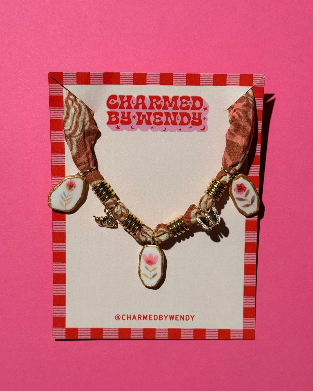 Crafted from 100% cotton Handker bandanas, this unique piece features three handmade polymer clay charms and two gold-plated metal charms. The stainless steel paper clip chain lets you adjust the length up to 19" for the perfect fit. Light, comfortable, and one of a kind, this necklace is a fun way to express your style!